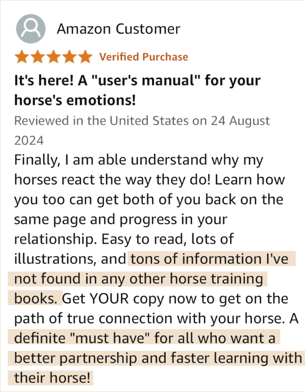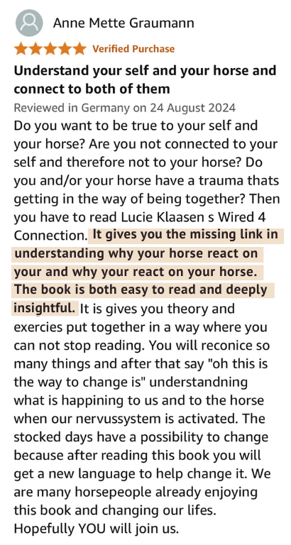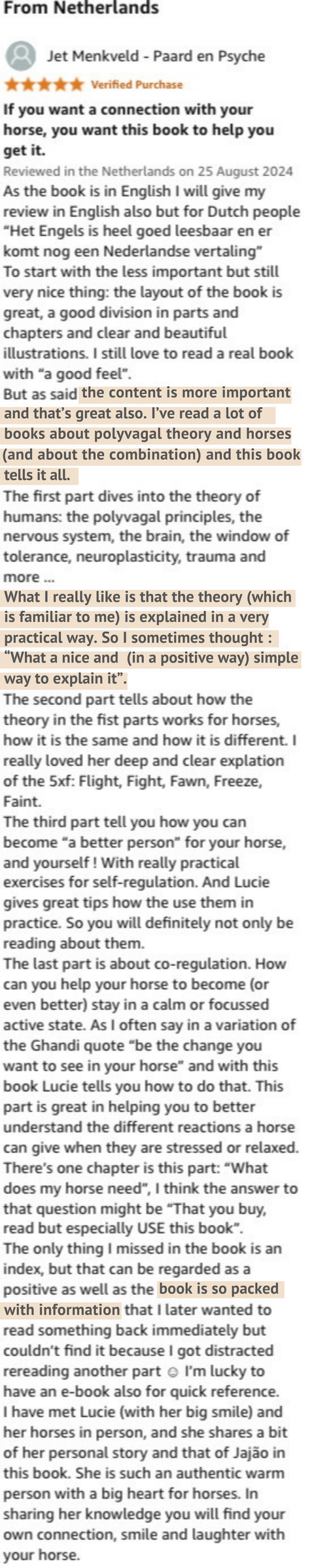 "Lucie Klaassen has written a book that is both accessible and chock full of vital information regarding the relationship between people and their horses. The book has a strong science-based approach and incorporates a mindset that considers the horse's and human's emotional, psychological and cognitive states. The design and writing style makes this informative book very 'user-friendly.' There is a ton of useful knowledge incorporated in this guide."